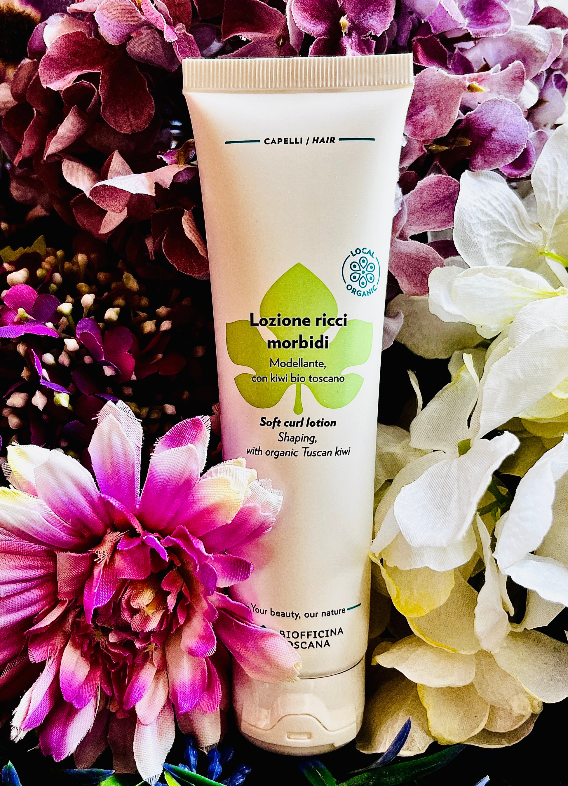 Una lozione modellante leave-in per capelli ricci e mossi. Con estratto di kiwi bio toscano ricco di zuccheri, alfa-idrossiacidi unito ad altri mirati estratti bio, acque stimolanti di salvia e rosmarino, proteine vegetali, burri e gel naturali. Non appesantisce il capello, ma lo nutre rendendo i ricci morbidi, naturalmente definiti e disciplinati.